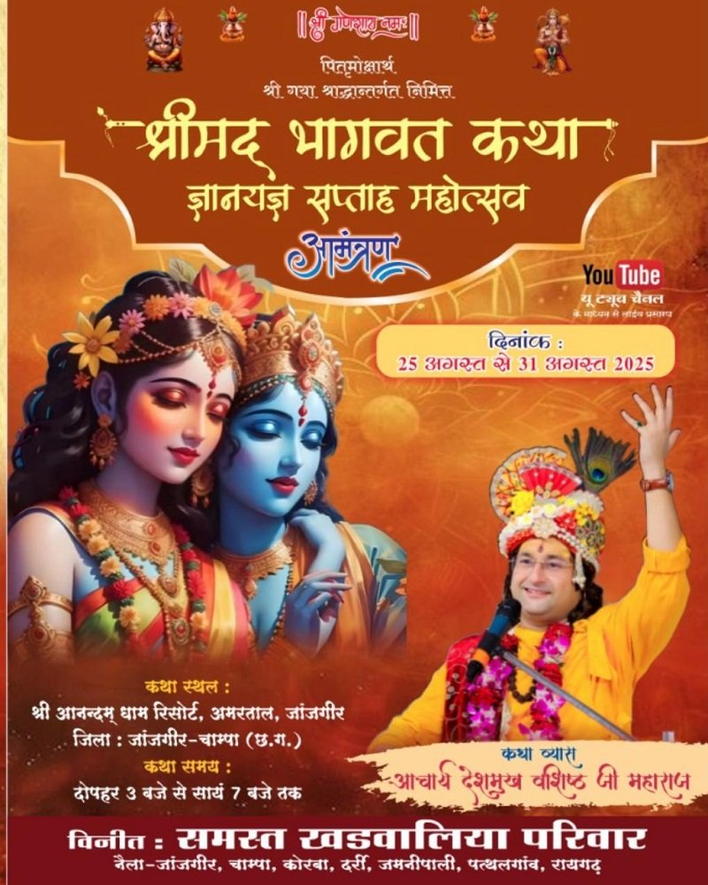 जांजगीर चांपा – खडवालिया परिवार द्वारा आयोजित गया जी श्रीमद् भागवत कथा का आयोजन 25 अगस्त 2025 से 31 अगस्त 2025 तक अमर ताल स्थित आनंदम धाम में आयोजित किया गया है जिसमें कथा वाचक के रूप में आचार्य देशमुख वशिष्ठ जी महाराज मथुरा वृंदावन के मधुरवाणी से कथा का रसपान कर भक्त व भाव विभोर होंगे एवं कार्यक्रम संपन्न होगा।